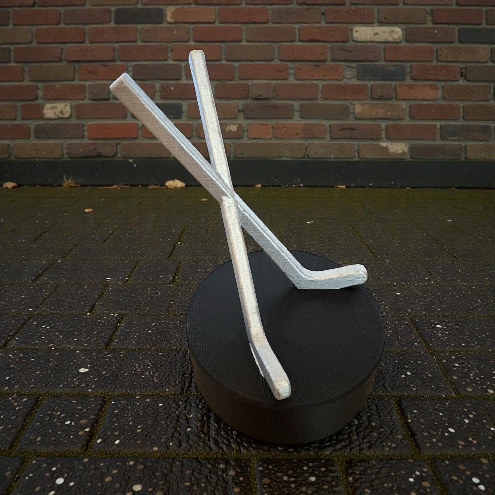 - Diseño en forma de puck de hockey con palos cruzados
